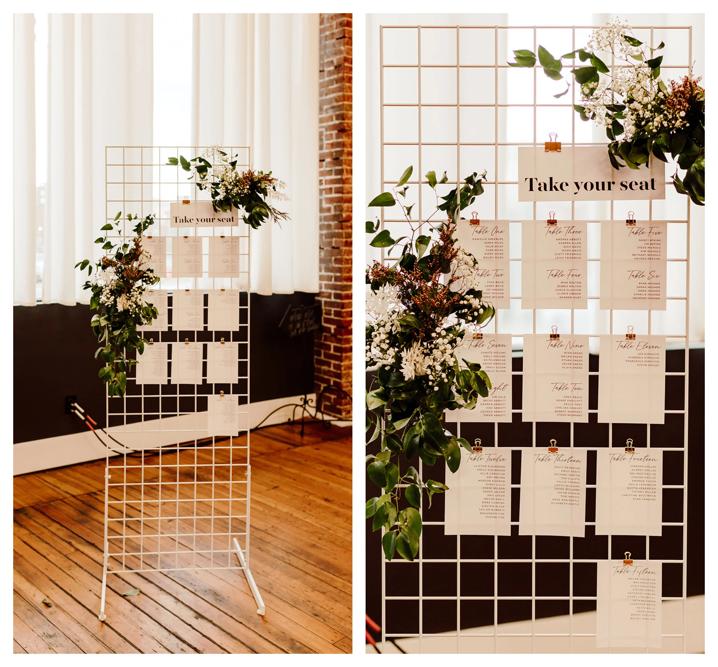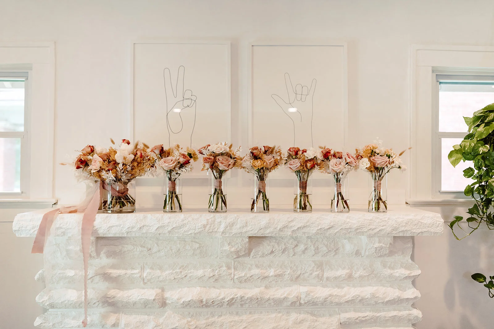 “I wanted to utilize the venue space as much as possible so we played up the urban garden and flowers. Our wedding vibe was a combination of soft, romantic, and modern. Our colors were different shades of blush pink, dusty rose, and mauve. This opened up a lot of opportunities for decor since we didn't have one specific color in mind. We utilized a lot of the venue's gold accent decor and I designed all of the signage to be simple black and white to make it modern.”
