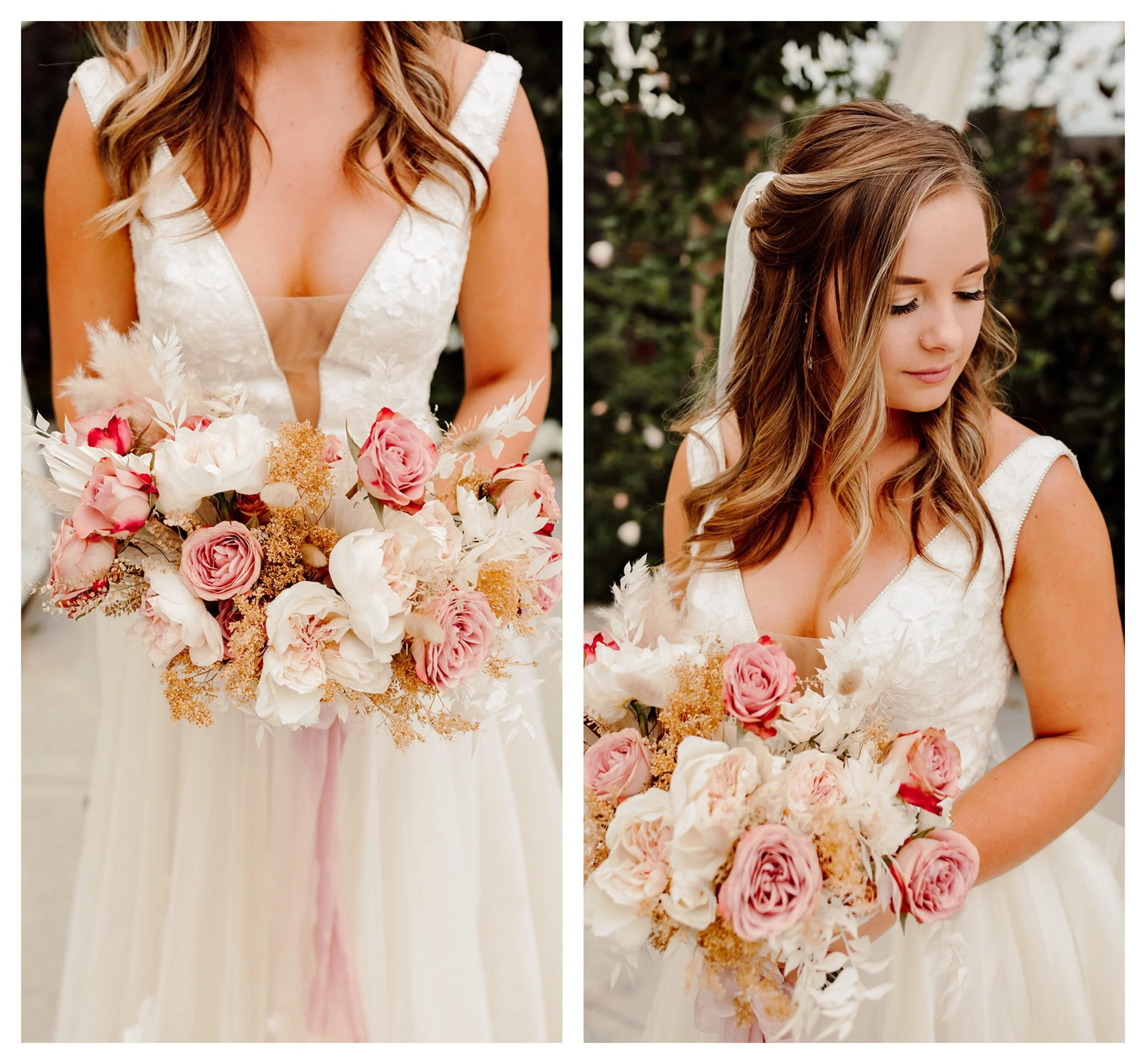 “How can I choose just one? I often look back at the time that Tyler and I snuck out of the reception for golden hour/sunset photos. It was a beautiful sunset, the weather was perfect, and it was nice to get a breath of fresh air and some quiet time with just Tyler and me alone. Though my absolute favorite moment didn't actually happen during the wedding. Tyler and I read personal vows to each other during our ceremony but while I tried to pay as much attention to them as possible, I was still caught up in the moment and didn't get to fully soak it in. So after the wedding, we stayed at the cutest Airbnb and read our vows to each other again.”
