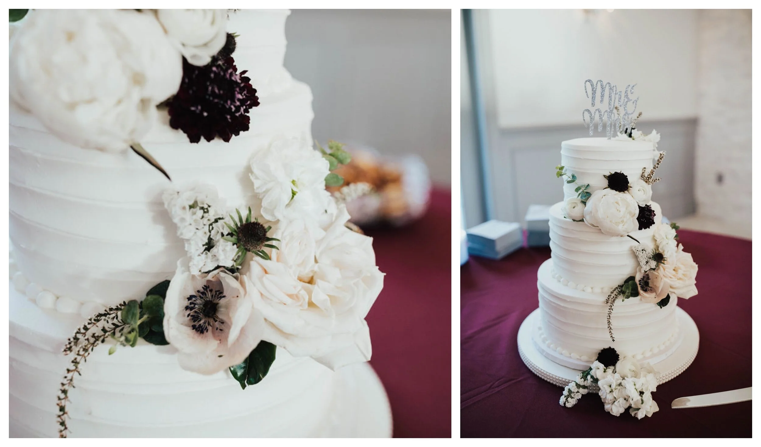 “I wanted an elegant, classic, traditional wedding look or theme. I have always loved shades of red + knew that I wanted my bridesmaids to be in a dark red or wine color. Kamron didn’t want to follow the navy or black tux trend + he wanted to go with something more unique like dark charcoal grey tuxes so I went with grey + silver tones, with white + black added in. We chose white + greenery for the flowers to go with the classical, timeless look.”